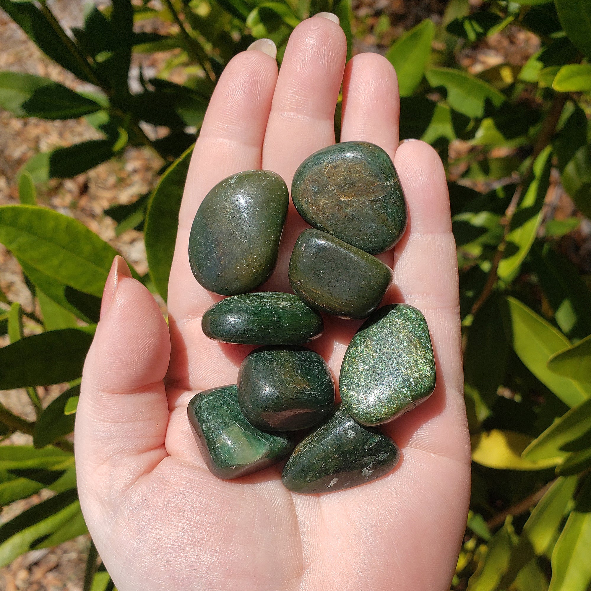 These tumbled stones are natural Fuchsite in Quartz and may feature dips, inclusions, or spots of texture as pictured. They have a slightly waxy texture.