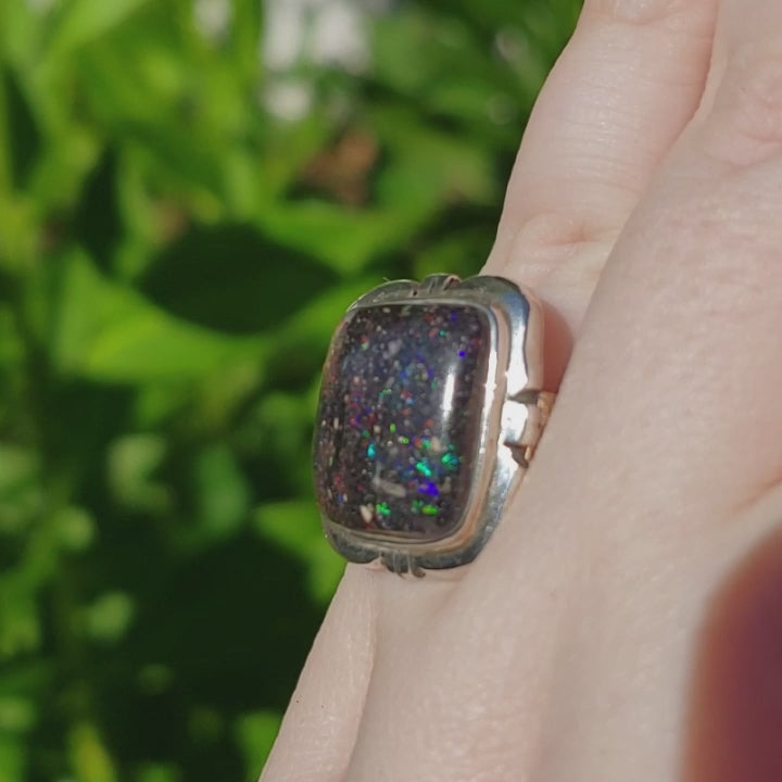 This Australian Opal Ring is a sight to behold, showing glimmering rainbows from within as it is turned in the light. With its Sterling Silver band and setting, this black Opal is truly a statement piece, bound to be the new favorite of your collection. It is a one of a kind Lightning Ridge, Australian Opal, hand-cut and custom made by one of the owners of the mine from which it was dug.