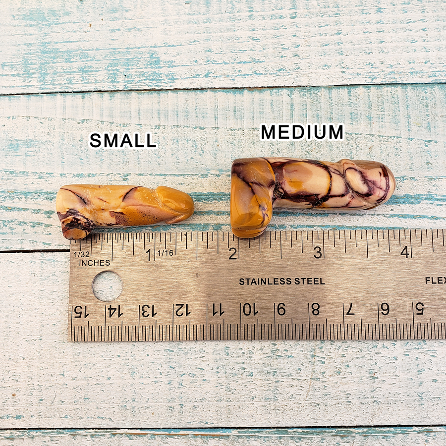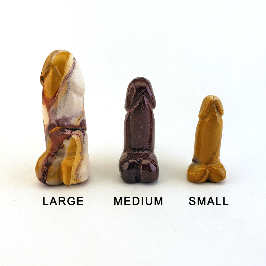 Phalluses are made of natural Mookaite and vary in color. Some phalluses feature inclusions or natural dips inherent to the growth patterns of the source stone. Sizing is approximate and may vary slightly from carving to carving as these are shaped by hand. No two are exactly the same!