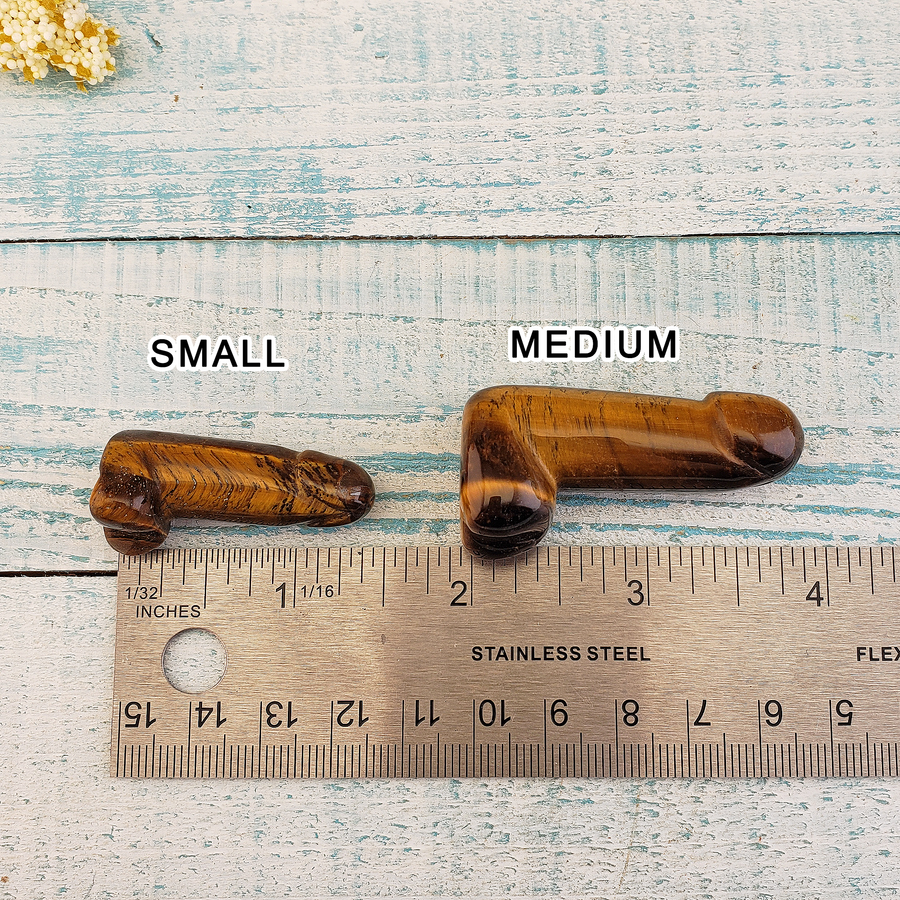 Phalluses are made of natural Tigers Eye and may feature inclusions or small dips inherent to the growth patterns of the source stone. Sizing is approximate and may vary slightly from carving to carving as these are shaped by hand. No two are exactly the same!