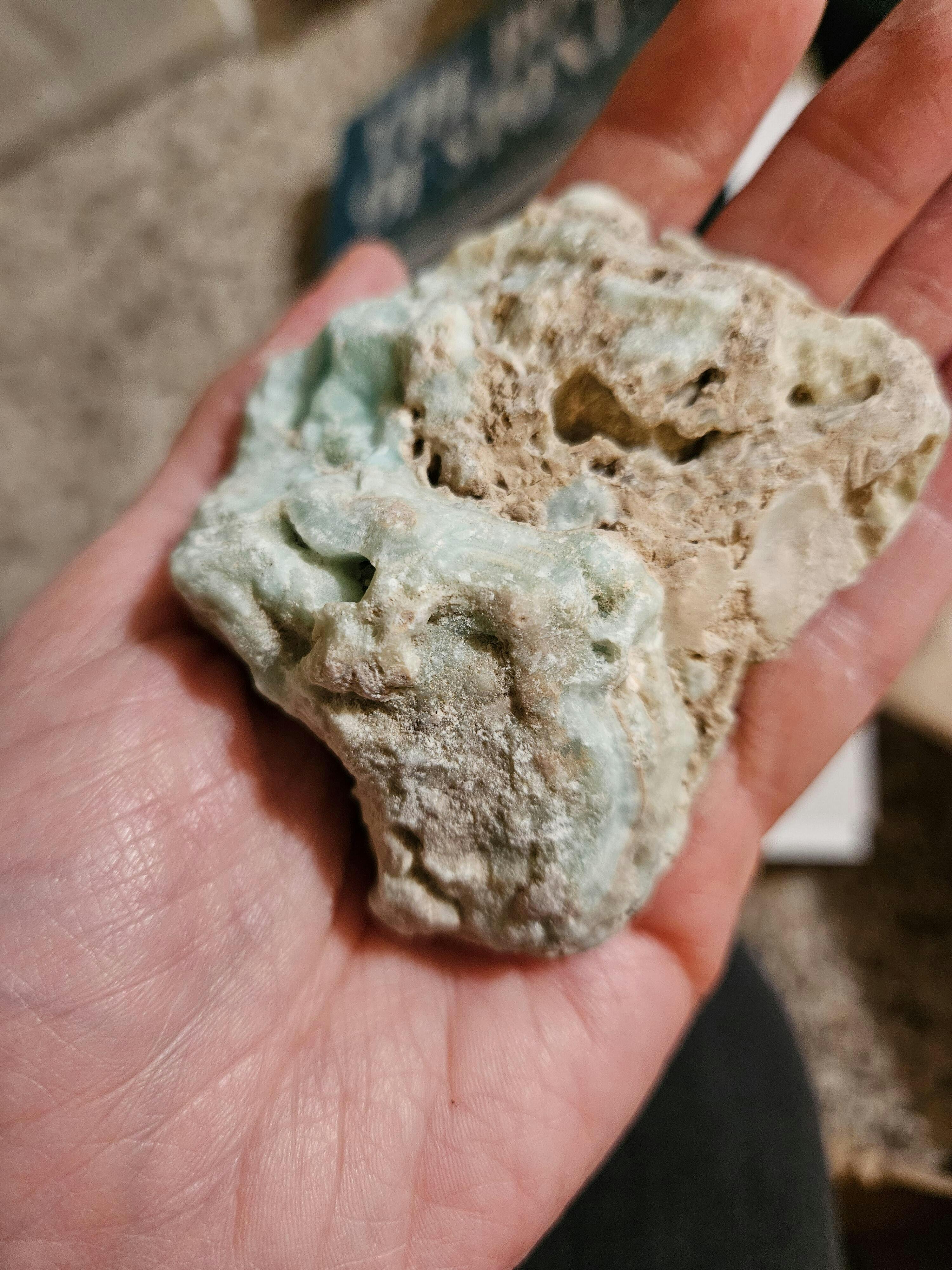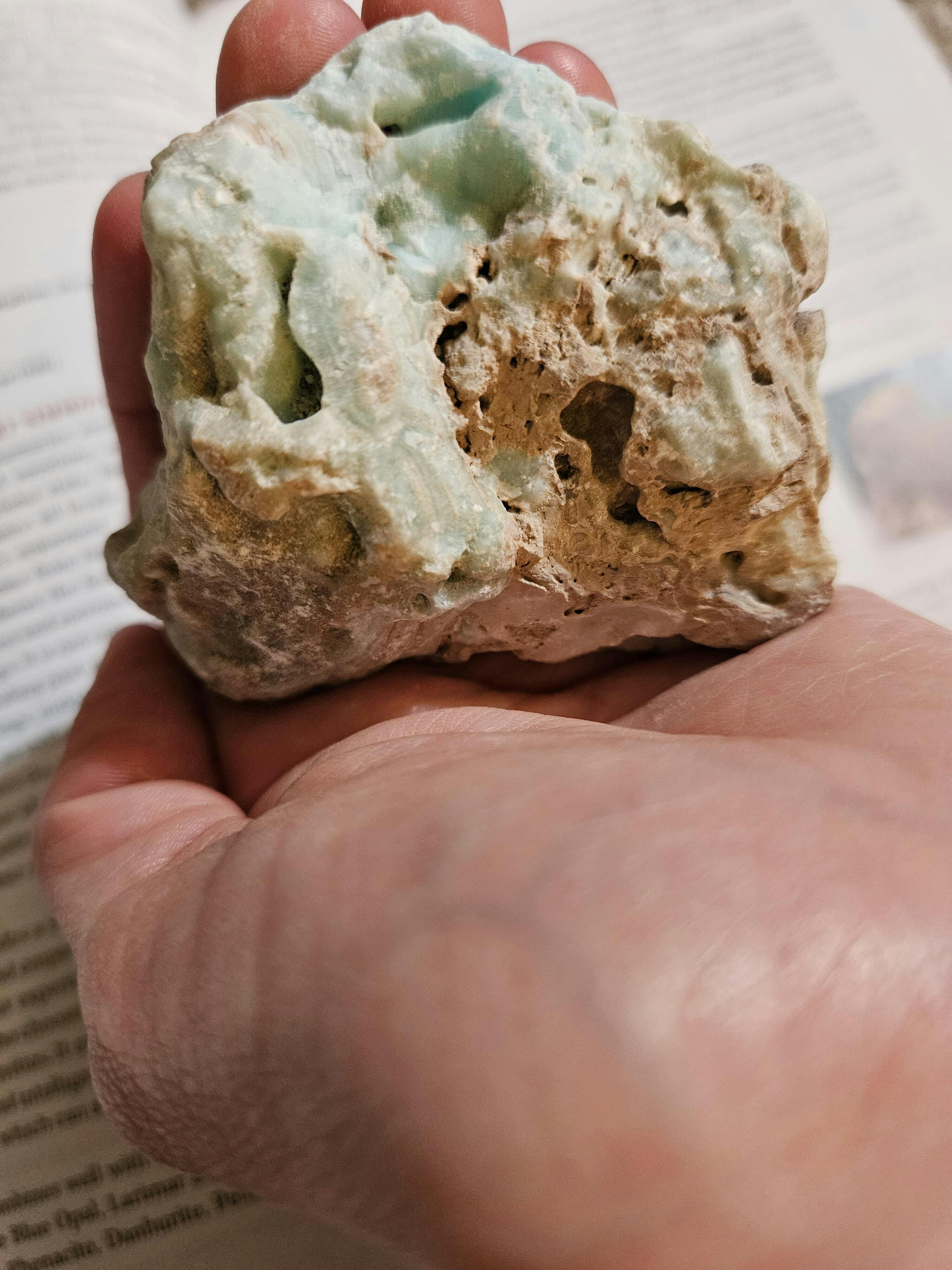 Blue Aragonite is pale pastel blue and sometimes has white flecks or sparkle to the gemstone. Some specimens may feature semi-translucence, depending on where they were sourced. It may exhibit natural pits or caverns due to the growth patterns of the stone.