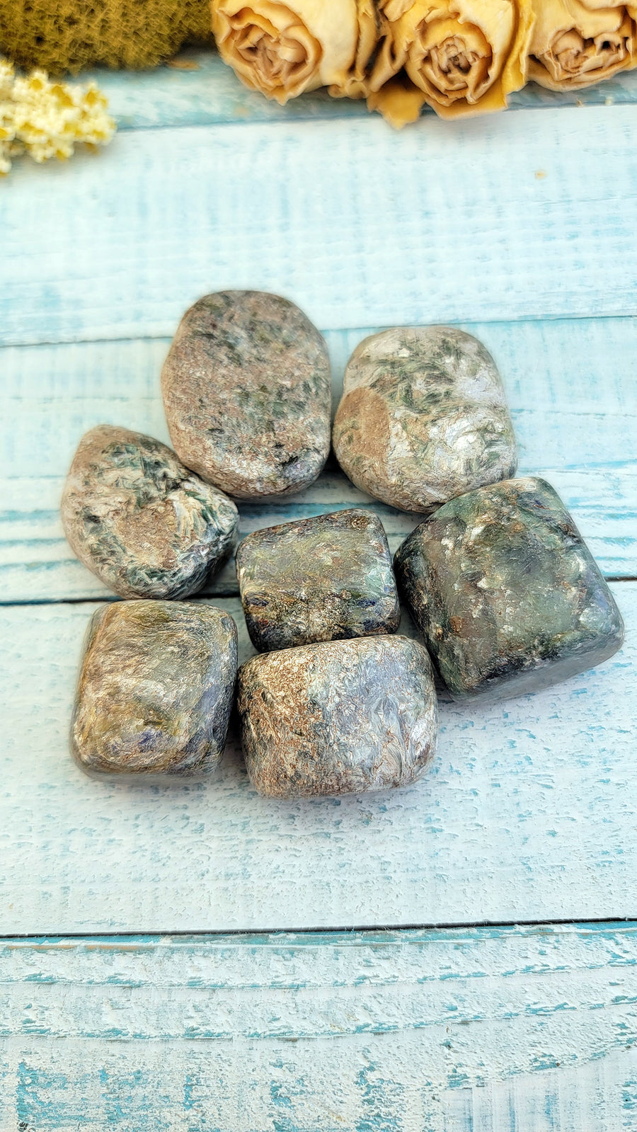 These blue-green kyanite tumbled gemstones measure approximately 0.75" - 1.25" long.
