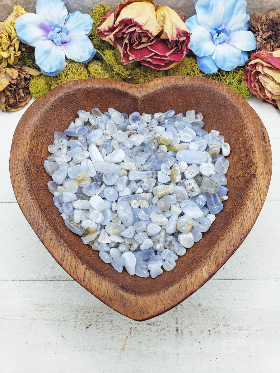 blue agate crystal chips in wooden heart bowl