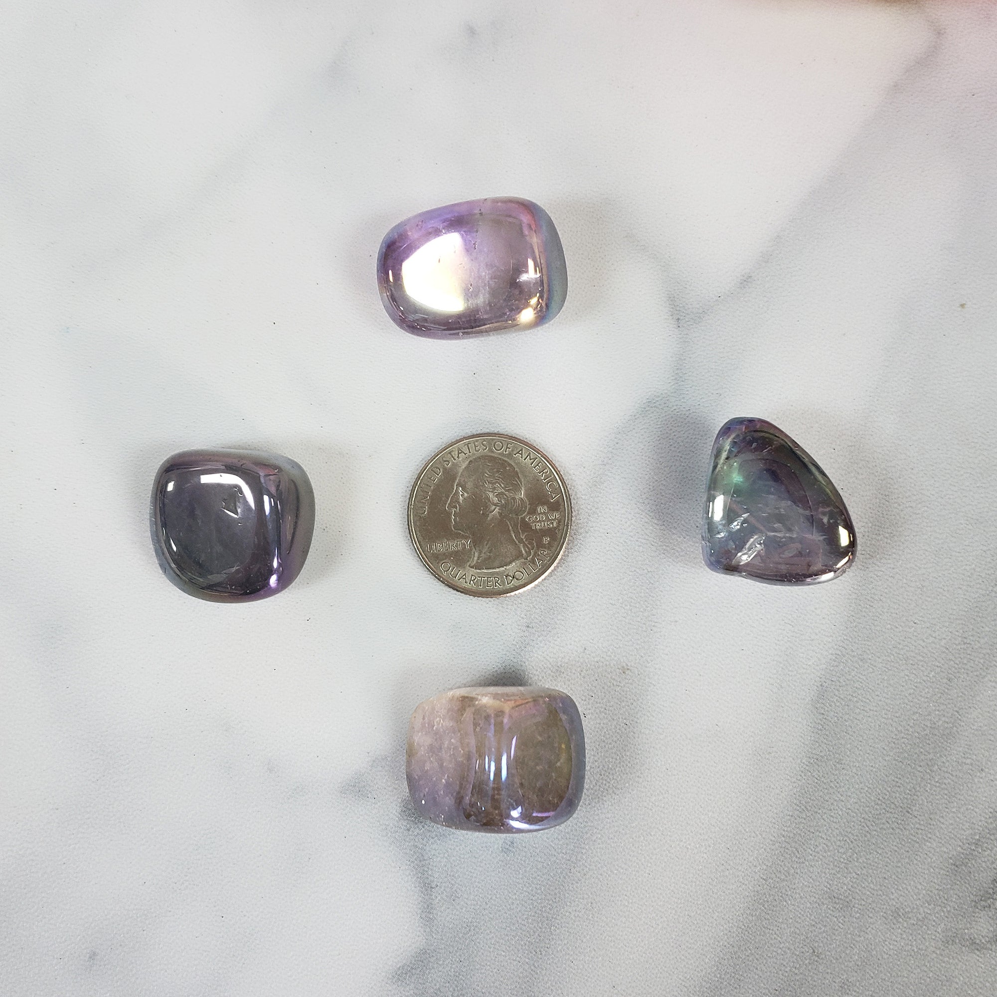 You will receive one Rainbow Aura Amethyst tumbled stone measuring approximately 0.75 - 1.1 inch long.