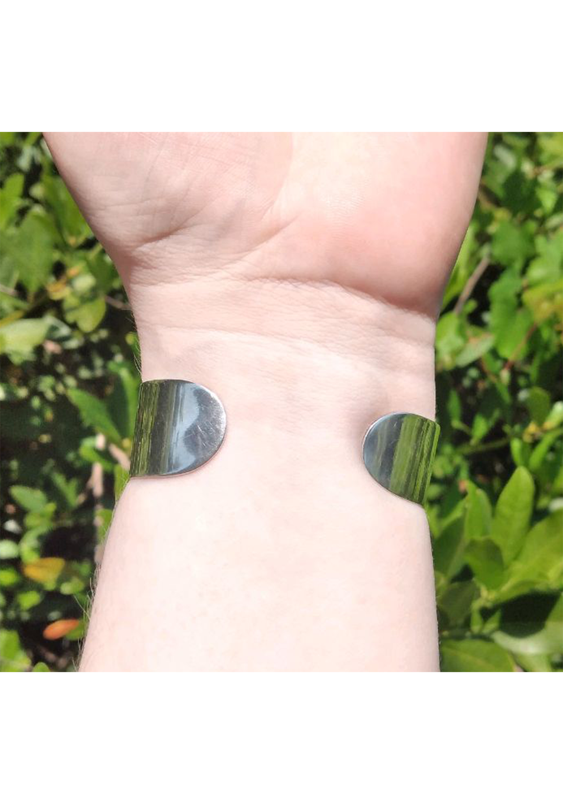The bracelet is 2.25" diameter that can gently be opened to a wider point and then clenched tighter around your wrist.
