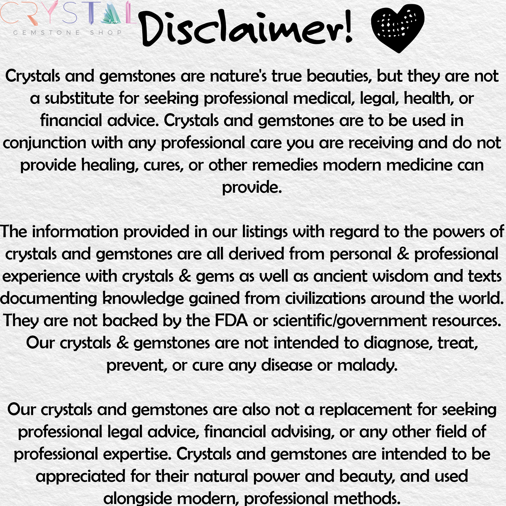 Crystals and gemstones are nature's true beauties, but they are not a substitute for seeking professional medical, legal, health, or financial advice.  Crystals and gemstones are to be used in conjunction with any professional care you are receiving and do not provide healing, cures, or other remedies modern medicine can provide.  The information provided in our listings with regard to the powers of crystals and gemstones are all derived from personal & professional experience with crystals & gems as well as ancient wisdom and texts documenting knowledge gained from civilizations around the world.  They are not backed by the FDA or scientific/government resources.  Our crystals & gemstones are not intended to diagnose, treat, prevent, or cure any disease or malady.  Our crystals and gemstones are also not a replacement for seeking professional legal advice, financial advising, or any other field of professional expertise.  Crystals and gemstones are intended to be appreciated for their natural power and beauty, and used alongside modern, professional methods.