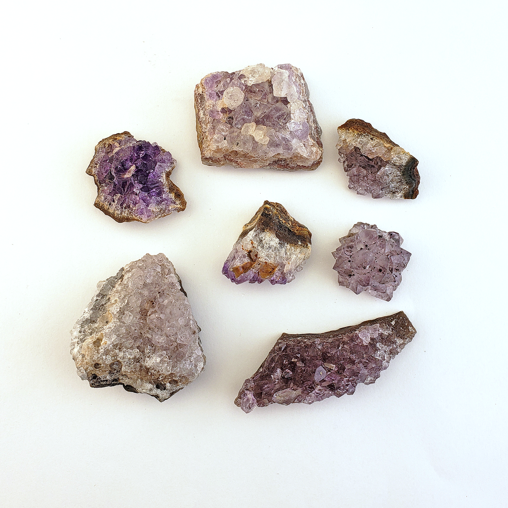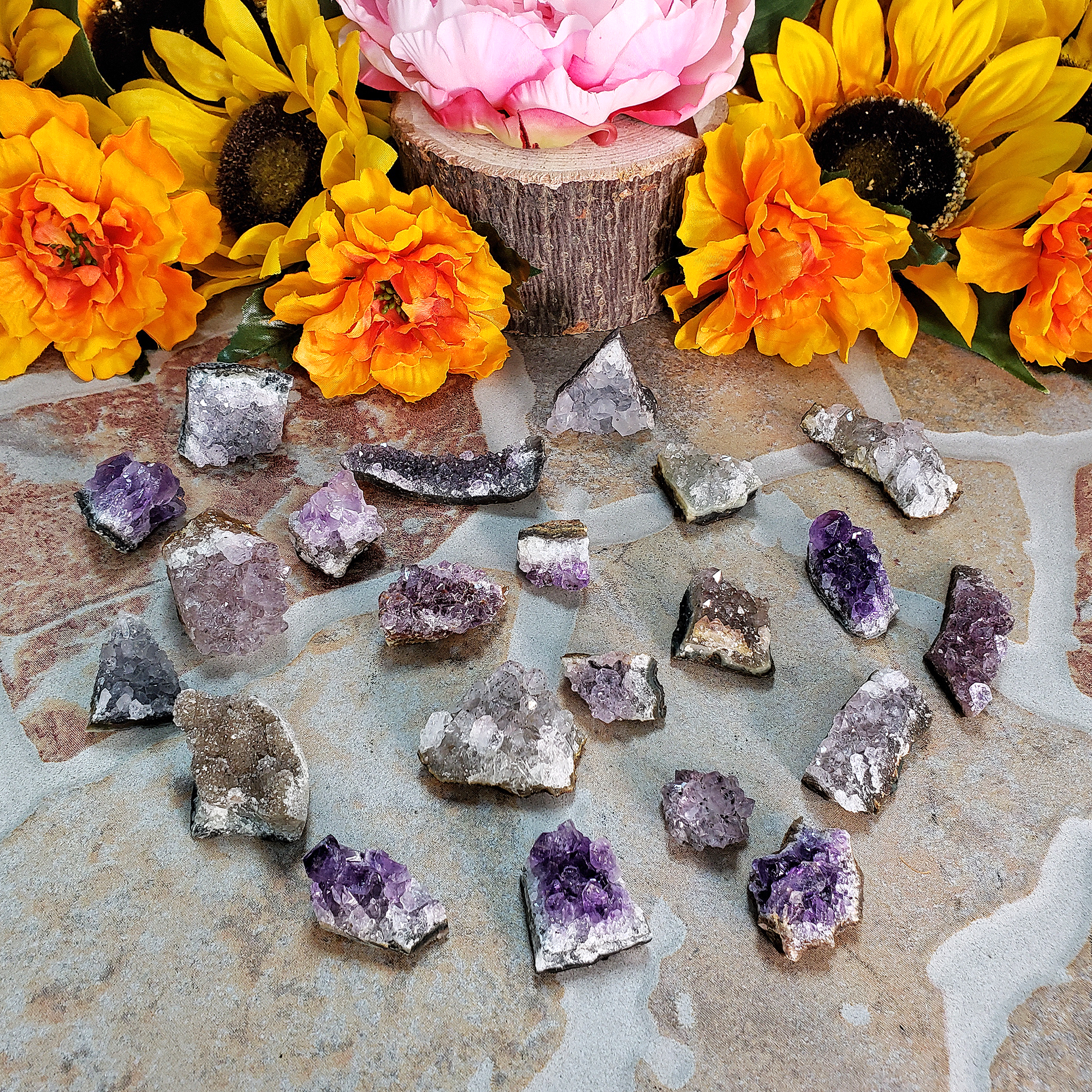Bring home a three ounce bag of mini raw Amethyst crystal clusters today! These adorable rough gemstones feature druzy Amethyst in delightful purple shades from pale to royal, glittering with natural beauty. Wonderful for jewelry-making projects, crystal grids, or crafts, these dainty crystal clusters show off the full range of Amethyst's glory!