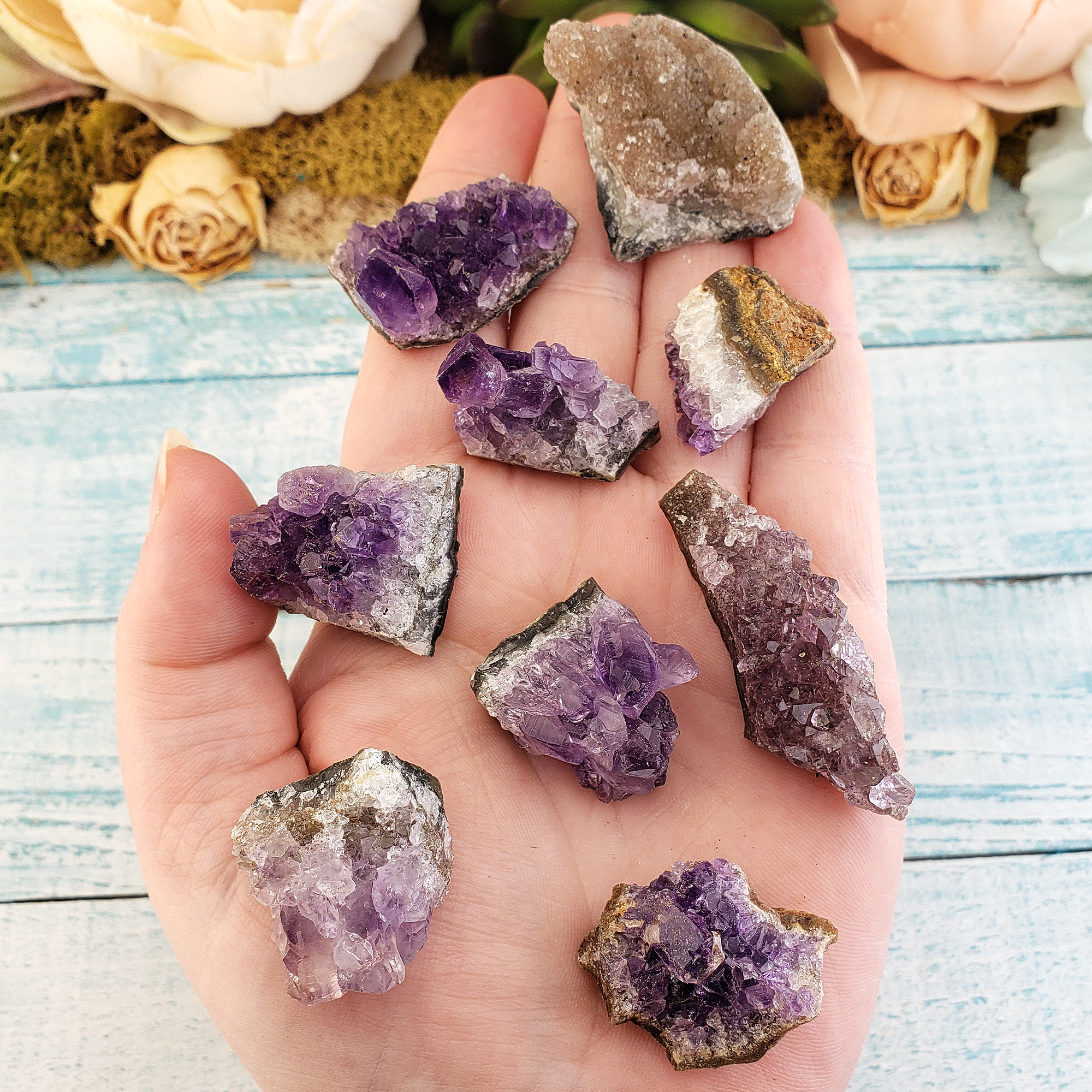 Since this item is sold by weight, the amount of raw Amethyst crystal clusters per bag will vary, but they typically hold between 2 and 10 mini crystal clusters depending on their size.