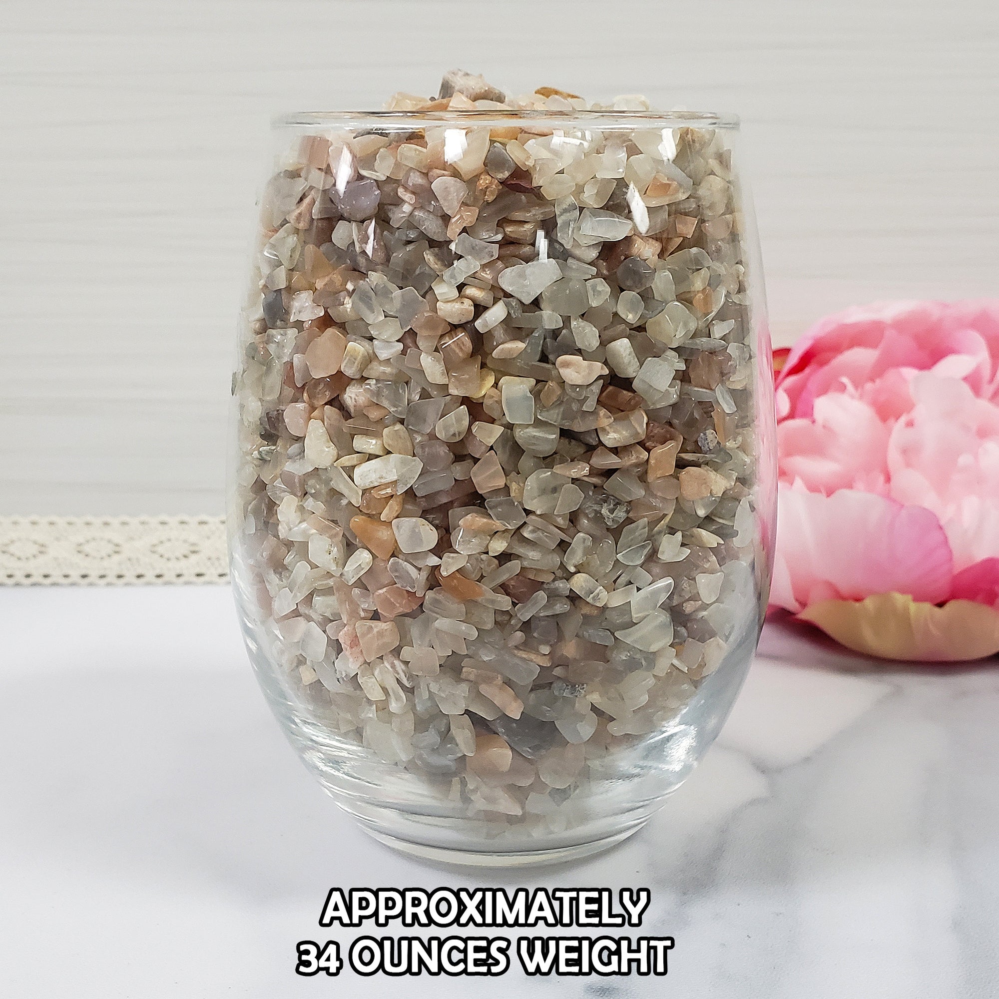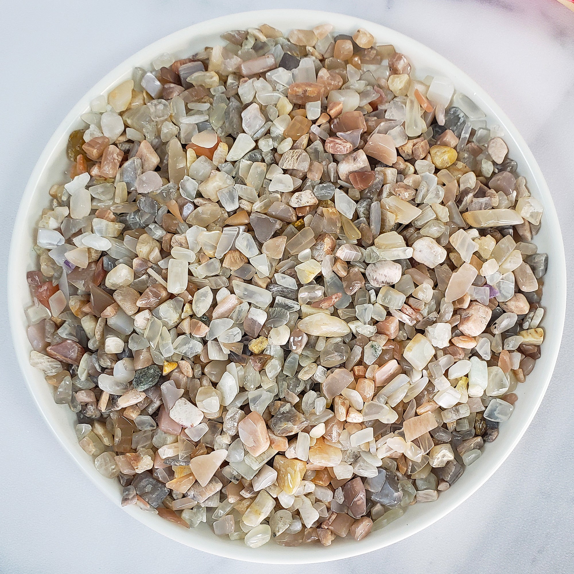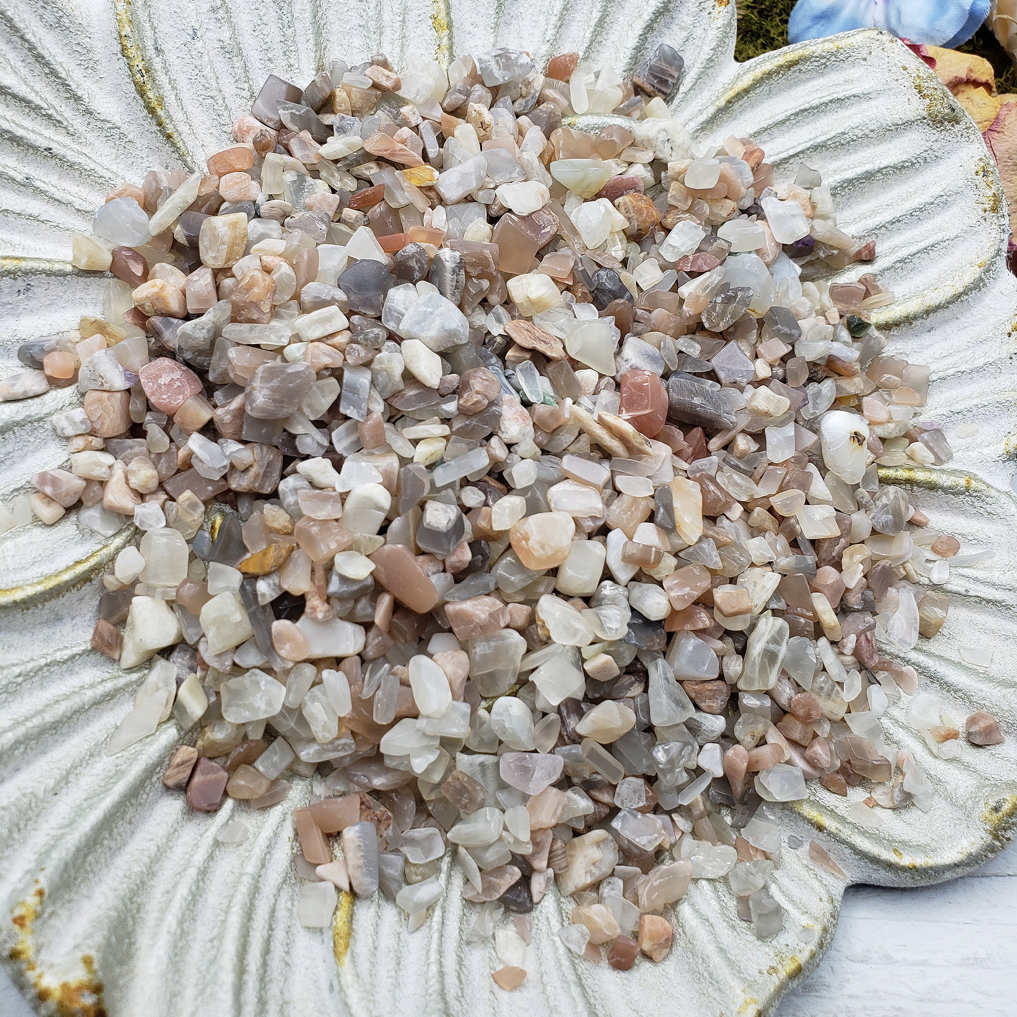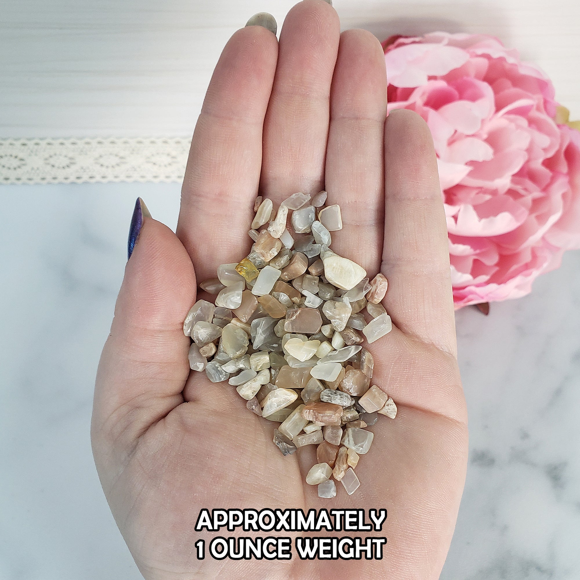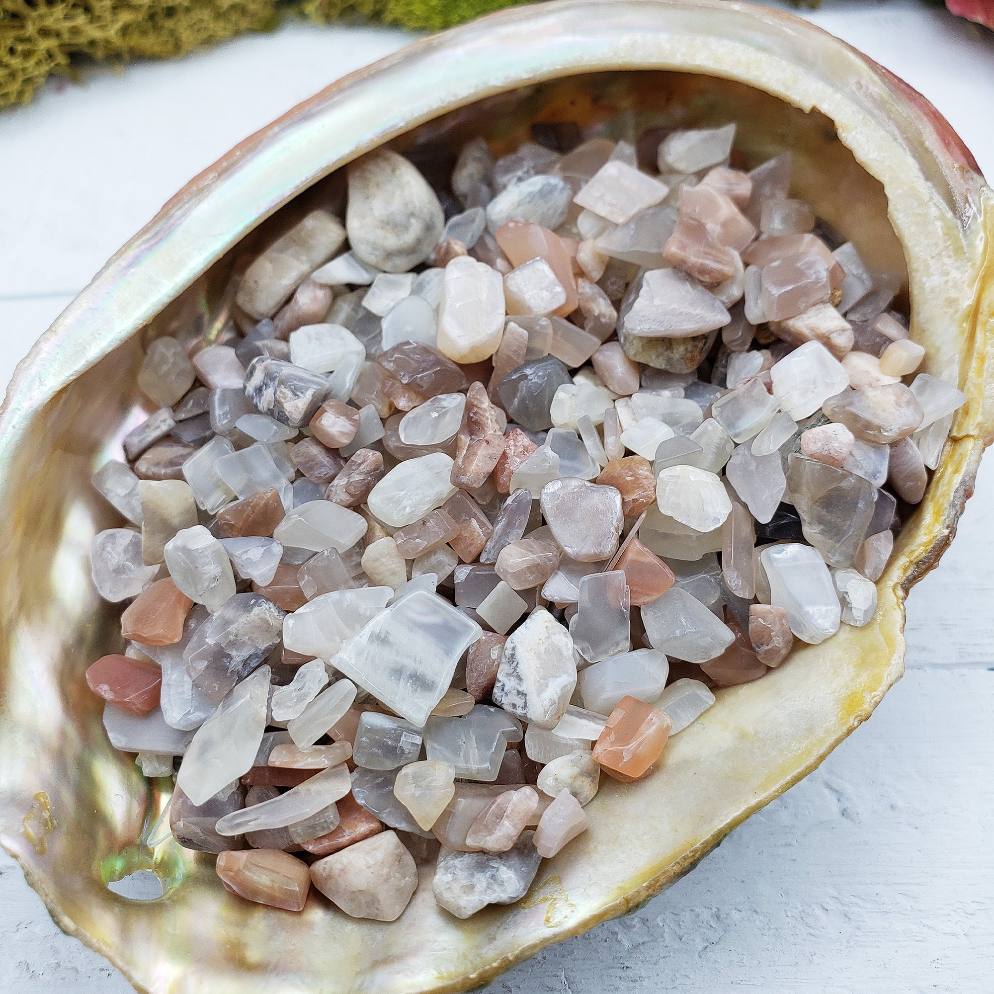 You will receive a bag of mixed Moonstone crystal chips weighing approximately 1 Ounce. These chips are approximately 2-6 mm and will feature a mix of White, Peach, and Black Moonstone. One type of moonstone may be more strongly represented than the others, depending on the mix.