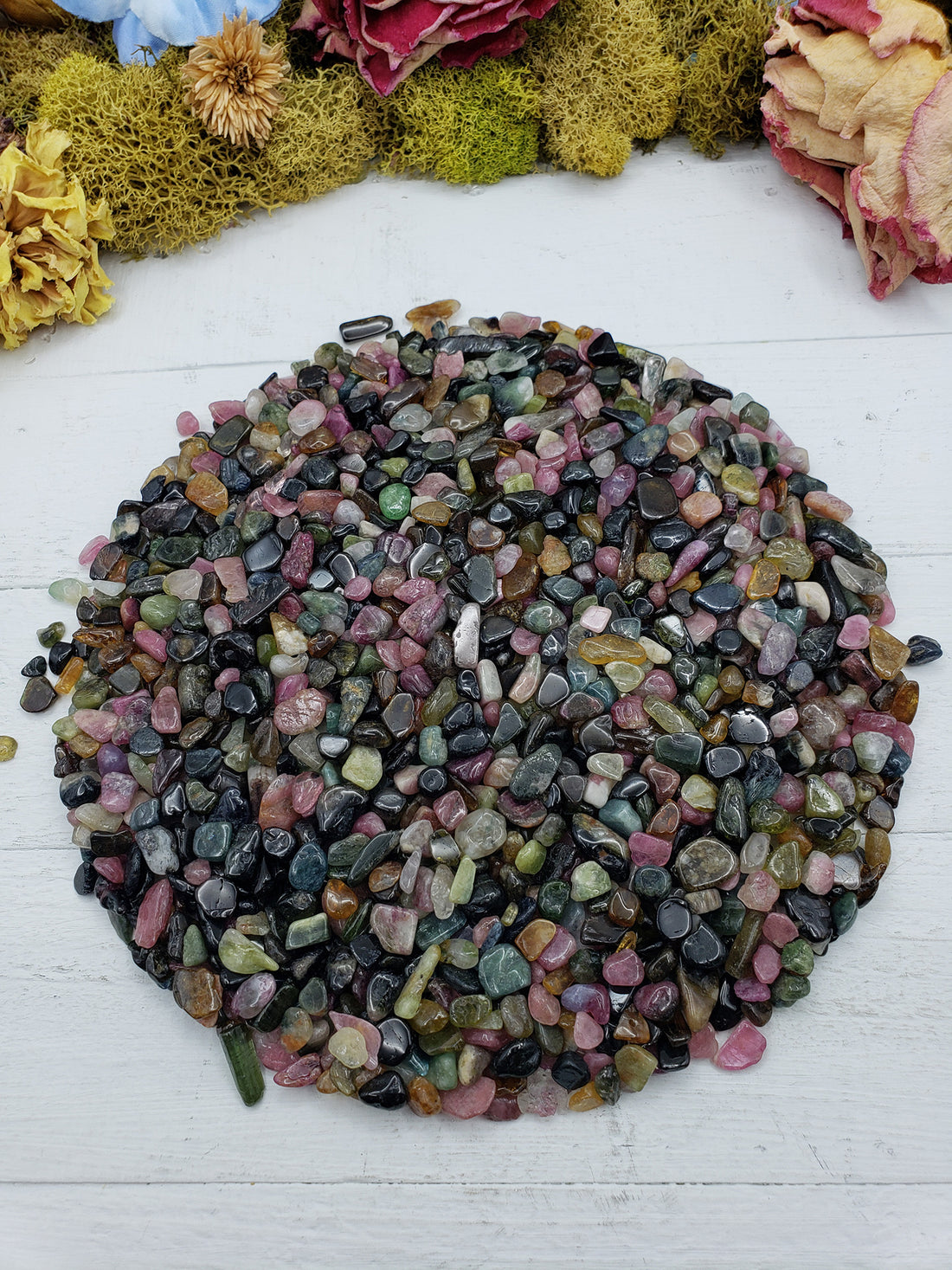 You will receive a bag of Multi Tourmaline chips weighing approximately 1 ounce. These chips are approximately 2 - 6 mm.
