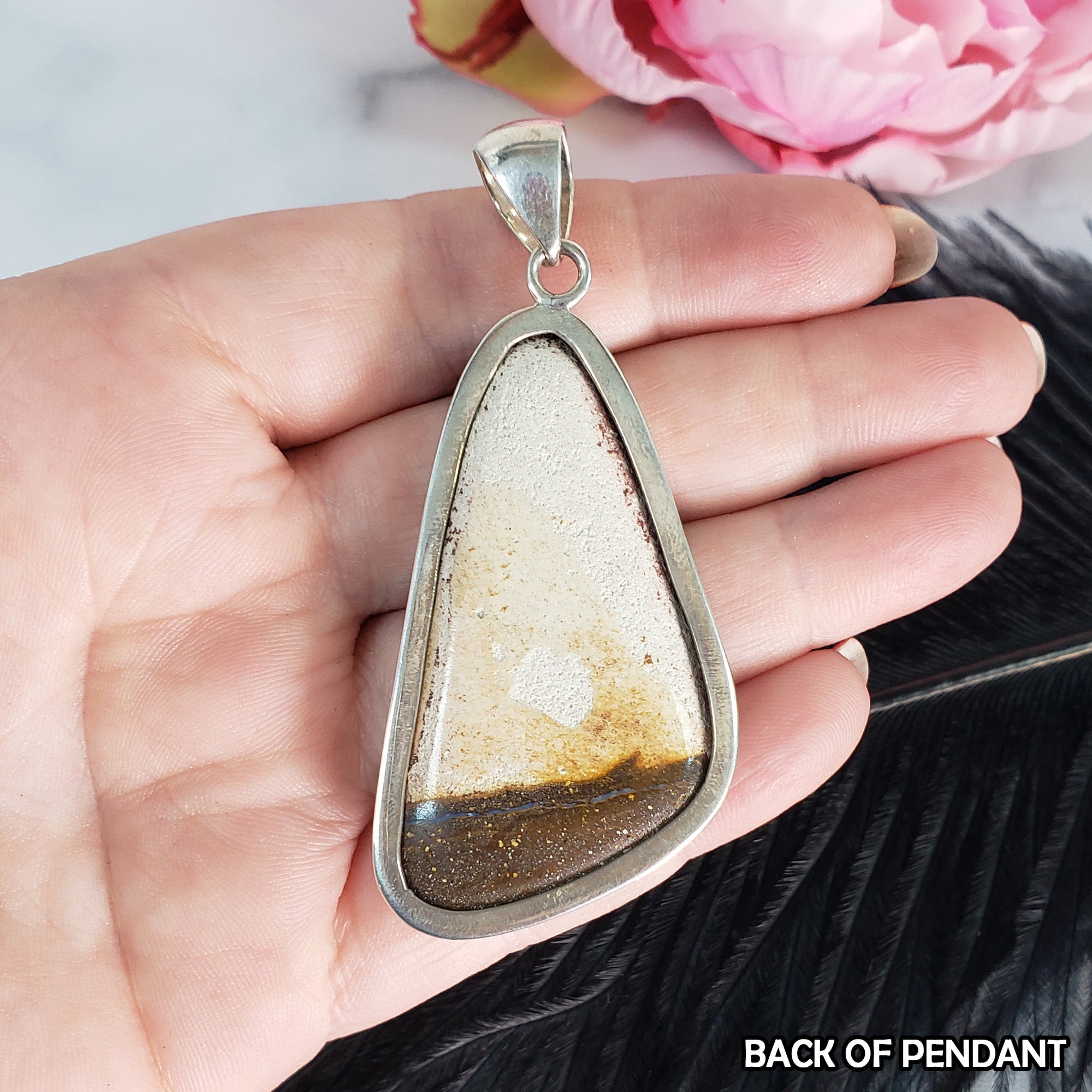 This huge 925 Sterling Silver pendant is a gorgeous statement piece for anyone who loves Opal jewelry! Featuring a soothing Boulder Opal cabochon with swirls of peach, mauve, cream, and blue hues, this one of a kind gemstone pendant is sure to delight the crystal lover in your life. Although it doesn't exhibit flash, this natural Boulder Opal pendant has a natural beauty all its own and an impressive size that's bound to turn heads!
